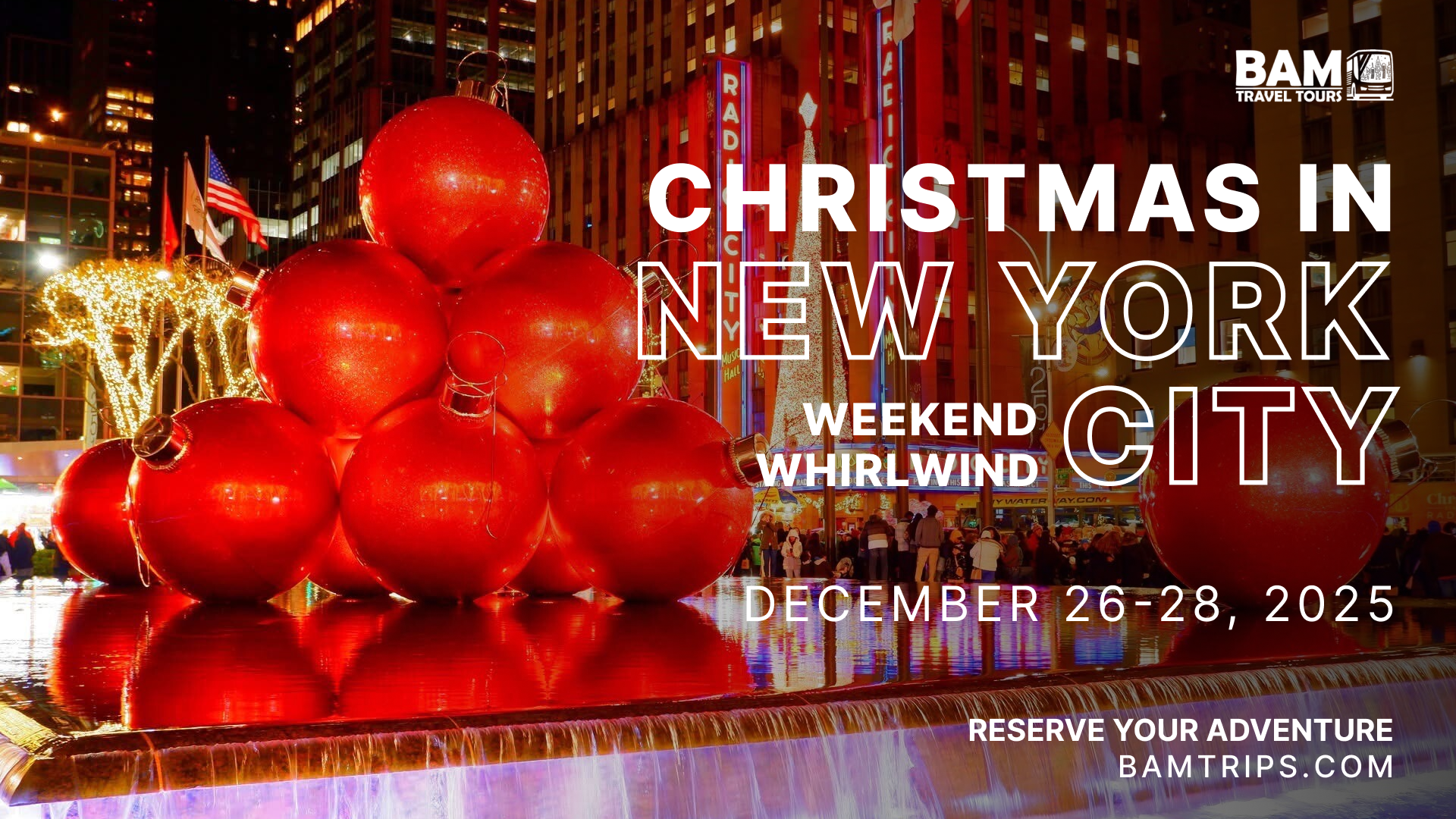 Join BAM Travel Tours for a magical December adventure in New York City! Travel overnight by motorcoach and wake up in the heart of Manhattan—ready to take in the twinkling lights, iconic sights, festive markets, and world-famous window displays that make NYC unforgettable at Christmastime.