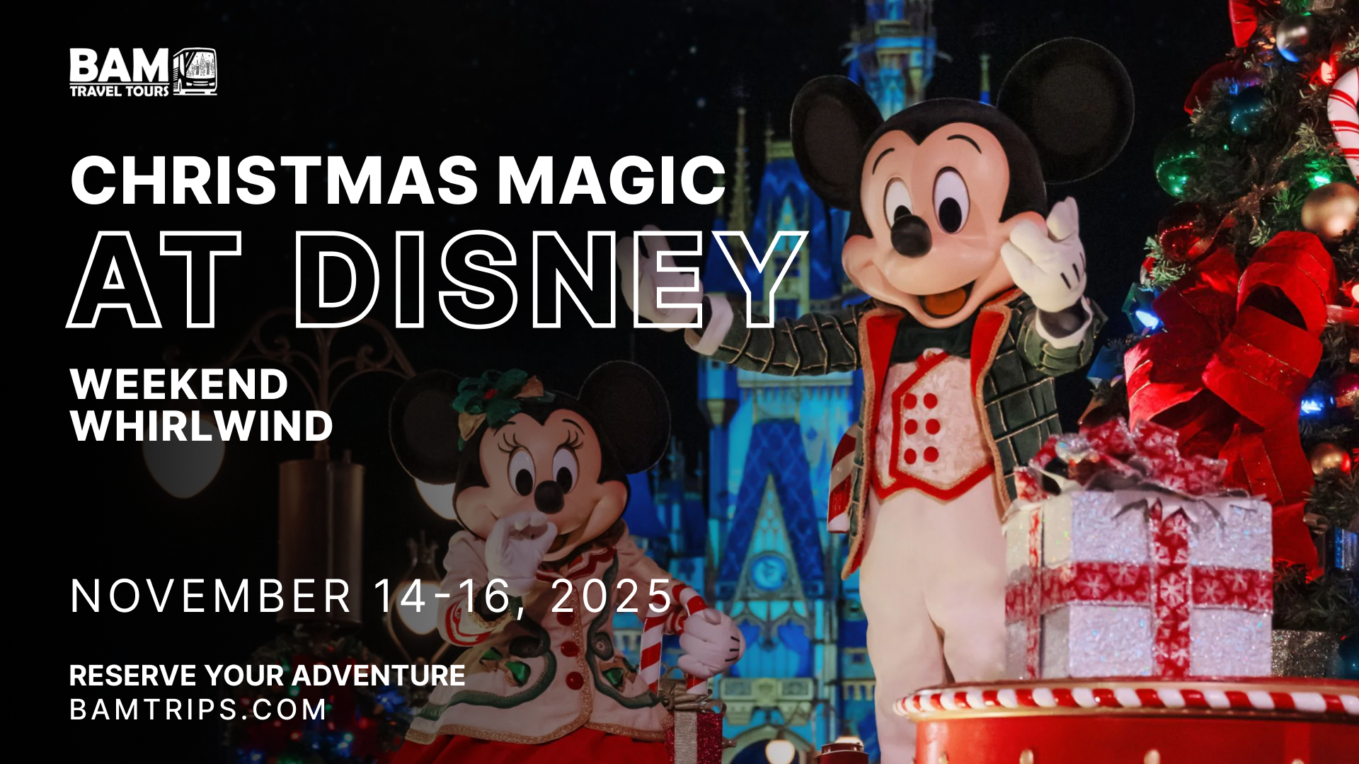 Celebrate the holiday season with BAM Travel Tours on a magical weekend getaway to Disney! Travel overnight by motorcoach to the most enchanting place on Earth, where twinkling lights, festive music, and magical memories await.