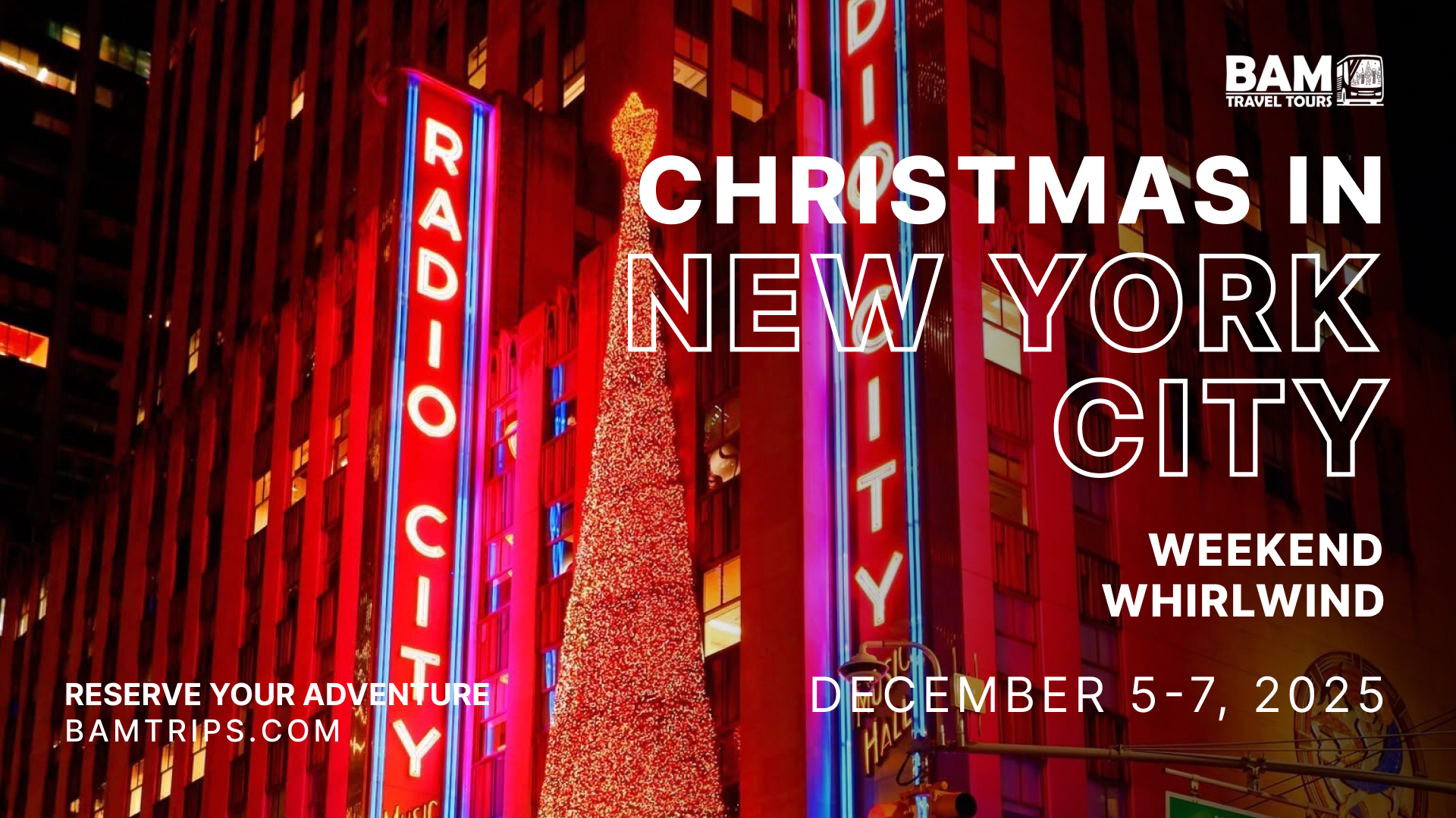 Join BAM Travel Tours for a magical December adventure in New York City! Travel overnight by motorcoach and wake up in the heart of Manhattan—ready to take in the twinkling lights, iconic sights, festive markets, and world-famous window displays that make NYC unforgettable at Christmastime.